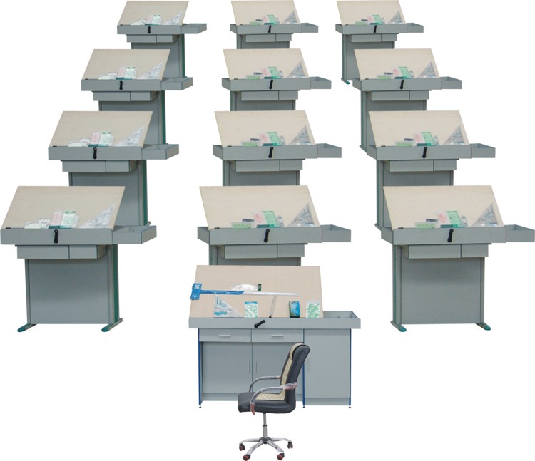 工程制圖是工程界的語言,工程制圖課程是理工科主要的技術(shù)基礎(chǔ)課,如何更快地培養(yǎng)學(xué)生的空間思維能力,更有效地掌握繪圖基本功,這是廣大師生多年愿望。 工程制圖實(shí)驗(yàn)室配套系列,可以創(chuàng)造一個(gè)要求的、清新的制圖環(huán)境與學(xué)習(xí)氣氛,有利于教學(xué)計(jì)劃的順利實(shí)施與教學(xué)質(zhì)量的提高。本系列包括學(xué)生制圖桌、教師演示臺(tái)、高亮度投影儀、活動(dòng)轉(zhuǎn)椅及教師桌。 工程其中學(xué)生制圖桌經(jīng)過多年的改進(jìn),具有實(shí)用方便配套齊全,輕巧大方堅(jiān)固耐用拆裝方便等特點(diǎn)。 每桌附有: 1.“基本形體”速成小模型一套,供建立投影概念的初始階段使用。 2.繪圖工具和儀器: a.一號(hào)圖板及相應(yīng)的一字尺裝置一套。 b.三角板(30厘米)一付、曲線板,比例尺,不銹鋼多用擦圖片各一付。 c.繪圖儀器(5件)、繪圖墨水筆(3支)各一盒。 d.常規(guī)與各種專業(yè)模板。 3.兩種制圖國家標(biāo)準(zhǔn)選用。